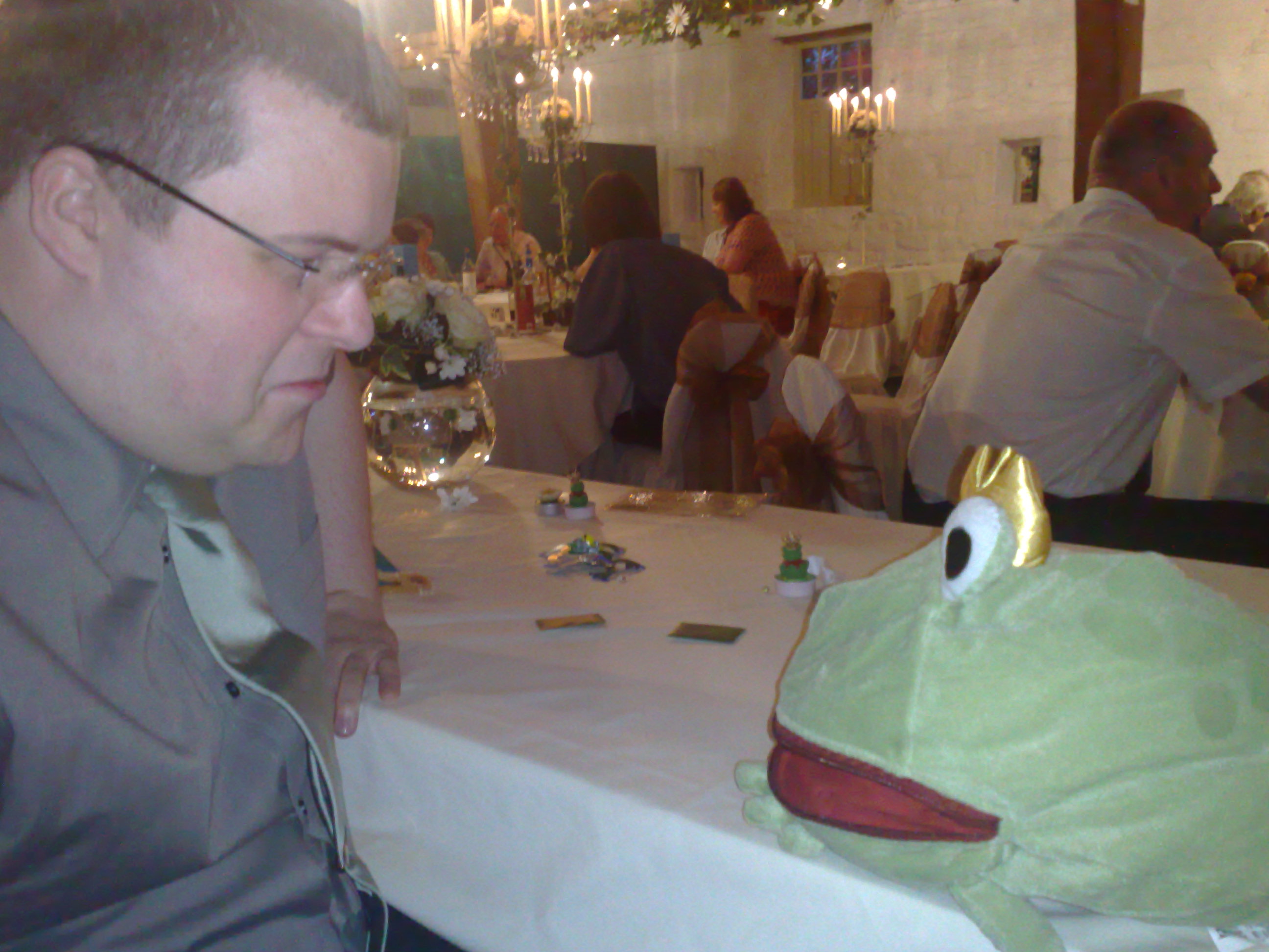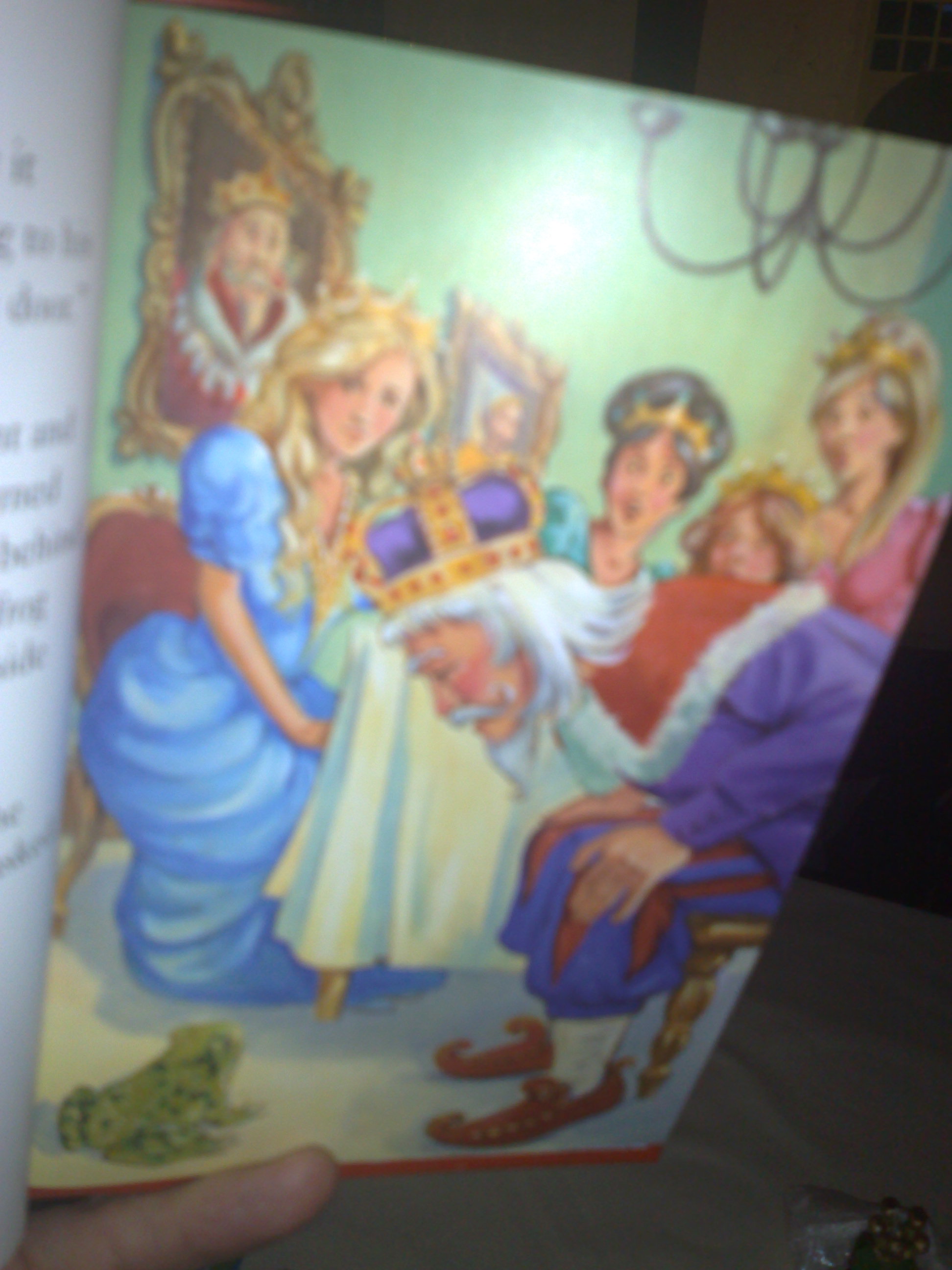 said the king to his daughter. "Go and open the door." The youngest princess went and opened the door. As she returned to her chair, the frog hopped behind her. When she sat down, the frog said, "Put me on the table beside you, please." The princess hesitated but the king told her to do as the frog asked. |