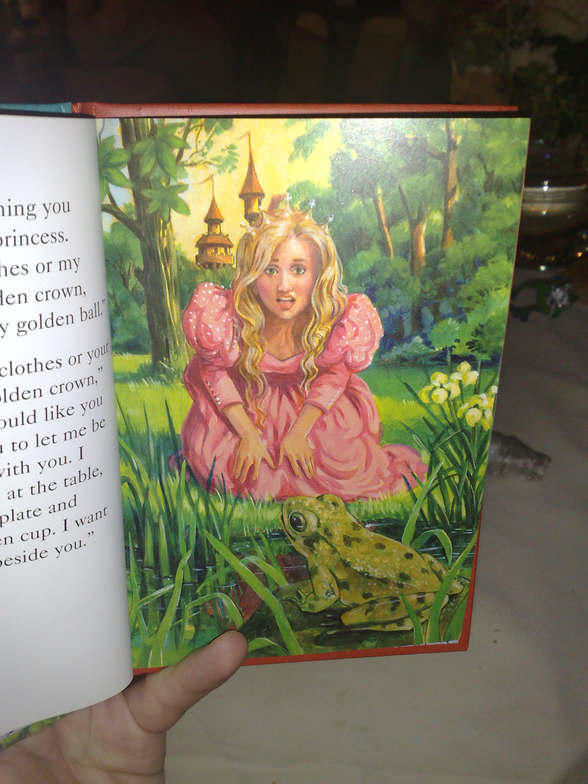 golden crown, if only you will find my golden ball." "I do not want your clothes or your jewels or even your golden crown," replied the frog. "I should like you to love me. I want you to let me be your friend and play with you. I want to sit beside you at the table, eat from your golden plate and drink from your golden cup. I want to sleep in your bed beside you." |