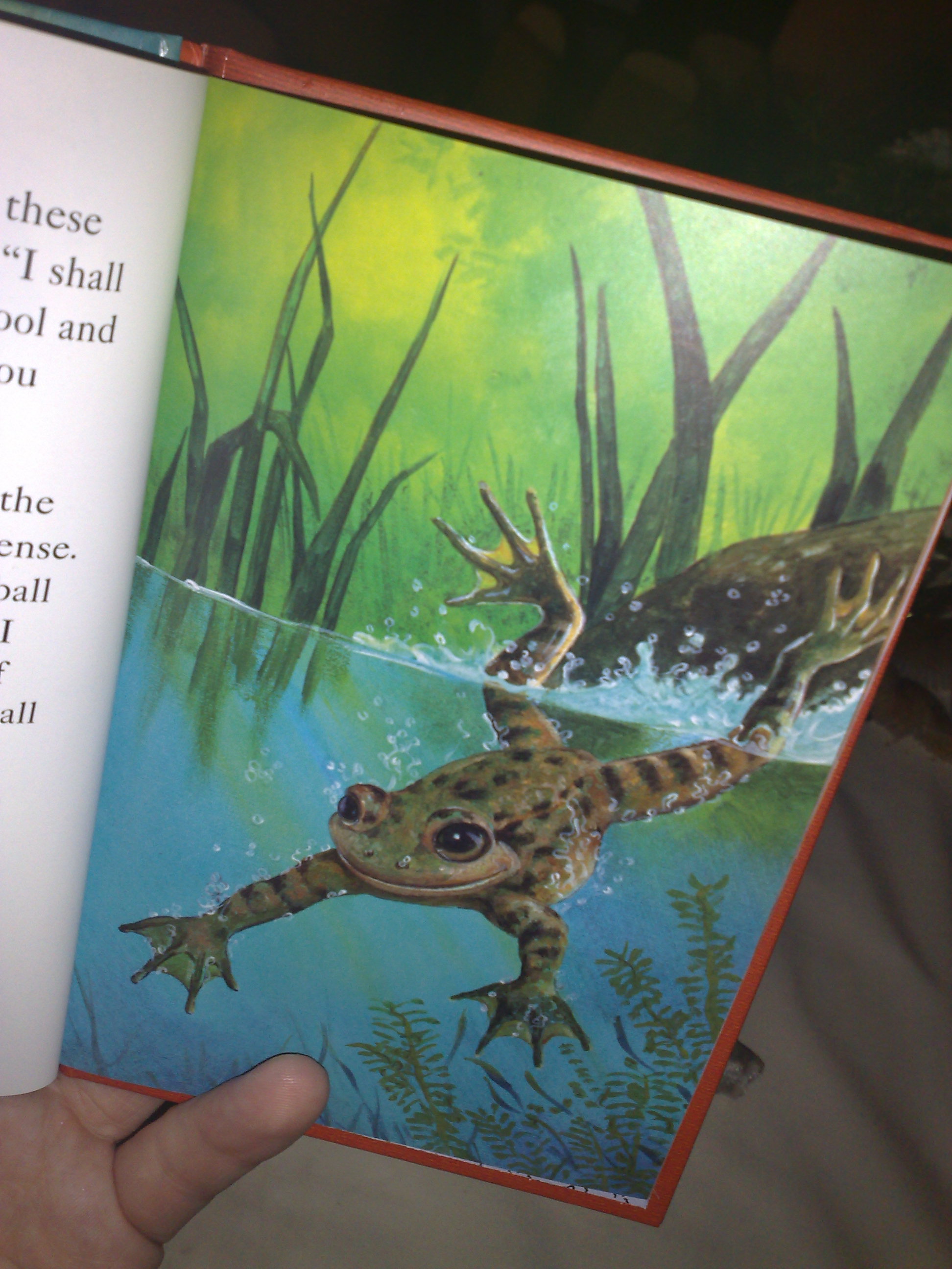 ball. Do you promise?" The princess thought that the frog was talking a lot of nonsense. Also, she wanted her golden ball very much. So she said, "Yes, I will promise all that you ask, if only you will find my golden ball for me." At these words, the frog dived into the pool. |